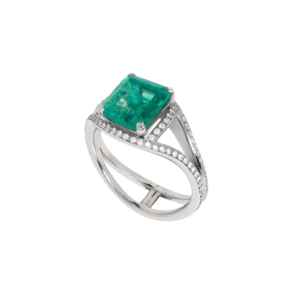 Découvrez notre réalisation sur-mesure : une bague en émeraude carré, certie de diamants et or blanc.