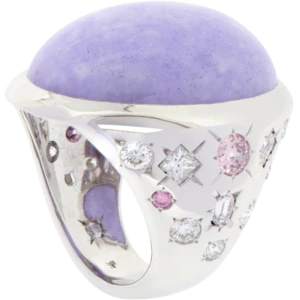 Bague en or blanc 18K, sertie d’un jade violet, 10 diamants blancs, 6 diamants roses, 6 diamants blancs baguettes.
