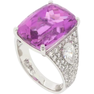 Bague en or blanc 18K sertie d’une kunzite rose, de diamants poires et de diamants ronds.