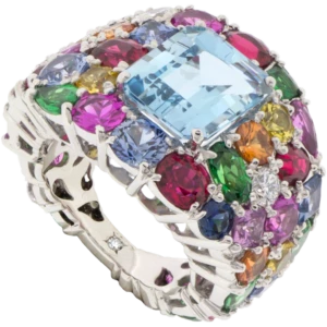 Bague pavée multicolore : sertie d’une aigue-marine, de tsavorites et de saphirs bleus, roses, jaunes, oranges et spinels. Bague en or blanc 18K.