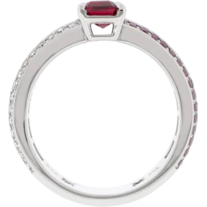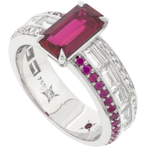 Profitez d’un bijou unique grâce à cette bague en or blanc sertie d’un rubis non chauffé, de baguettes diamants, de rubis ronds et de diamants blancs. Notre joaillerie Bengems, vous propose une pièce d’exception confectionnée avec soin au cœur de notre atelier à Genève en Suisse.