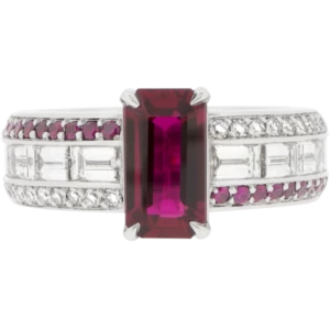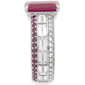 Bague en or blanc 18K sertie d’un rubis non chauffé, de baguettes diamants et de diamants et rubis ronds 8/8.
