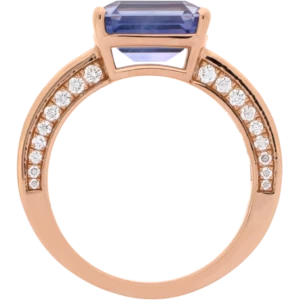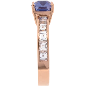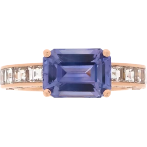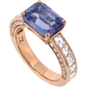 Bague en or rose 18K sertie d’un saphir octogonal bleu-violine, de 10 baguettes diamants blancs et de 36 diamants blancs.