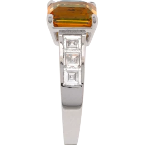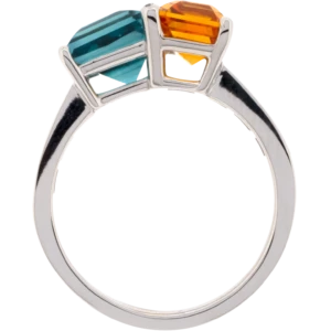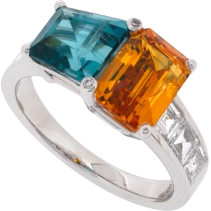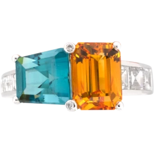 Bague en or blanc 18K sertie d’un saphir orange octogonal taille émeraude et d’une tourmaline trapèze octogonale sertie de baguettes diamants.