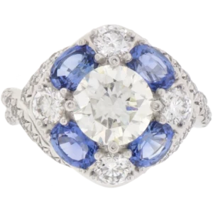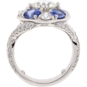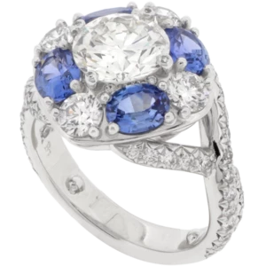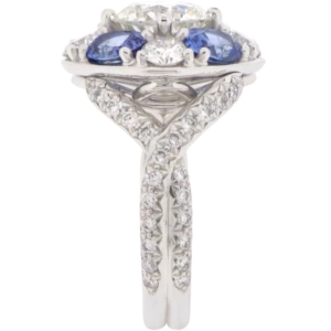 Bague en or blanc 18K sertie de saphirs bleus ovales et de diamants blancs.