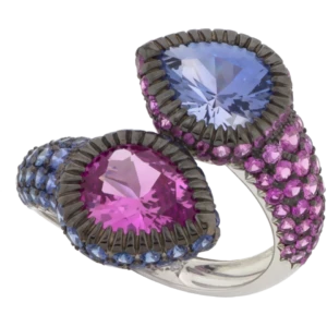 Bague Toi et Moi en or blanc noirci 18K sertie d’un saphir rose, d’un saphir bleu poires et de 140 saphirs ronds.