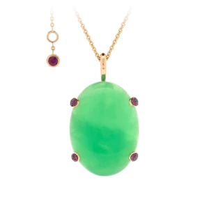 18K pink gold pendant set with one chysoprase and 4 rubies.