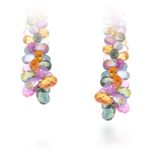 18K white gold earrings, set with 1 rose sapphire and 1 blue sapphire, 110 multicoloured briolettes sapphires and 10 white diamonds.