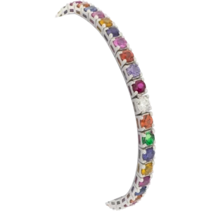 18K Tennis bracelet set with 2 rubies, 2 white diamonds, 2 tsavorites and 37 multicolored sapphires.
