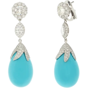 18K white gold earrings set with 2 drop turquoise, 2 white round diamonds, 2 marquise diamonds and 302 white diamonds.