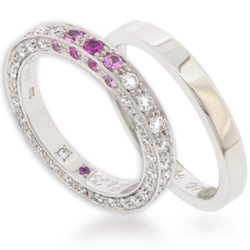 Choisissez par exemple une alliance en or blanc sertie de plusieurs rubis sur l’anneau et associez celle de votre partenaire avec un rubis central. Vos bagues de mariage seront alors assorties.