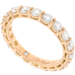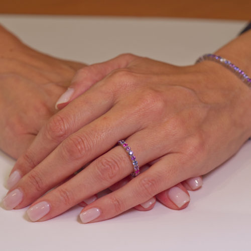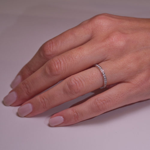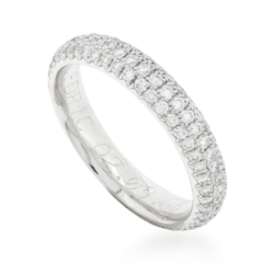 La bague complète se distingue par son sertissage intégral : des pierres sélectionnées avec soin qui courent tout autour de l’anneau pour un éclat continu et homogène. Un choix classique et luxueux qui symbolise l’amour ininterrompu.